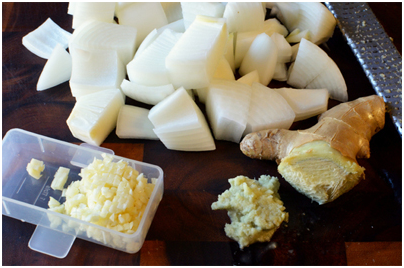 – Đầu tiên, bạn cắt hành tây thành miếng vừa ăn, băm nhỏ tỏi và gừng.